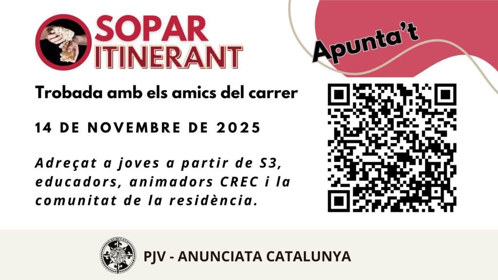 14 de novembre de 2025 Una oportunitat per viure la solidaritat i compartir el sopar amb els nostres amics del carrer.El Sopar Itinerant és una trobada oberta a joves a partir de S3, educadors, animadors del CREC i membres de la comunitat de la residència, per fer experiència de servei, pregària i fraternitat. Què farem Començarem amb un […]